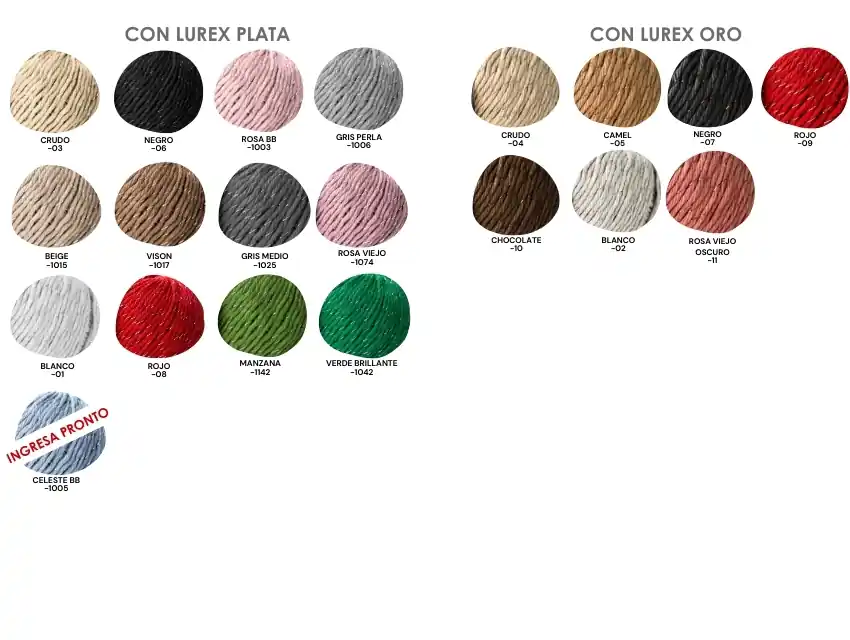 Composición: mix de algodón 8/6 y un cabo fino de lurex. 50grs = aprox 150 mts