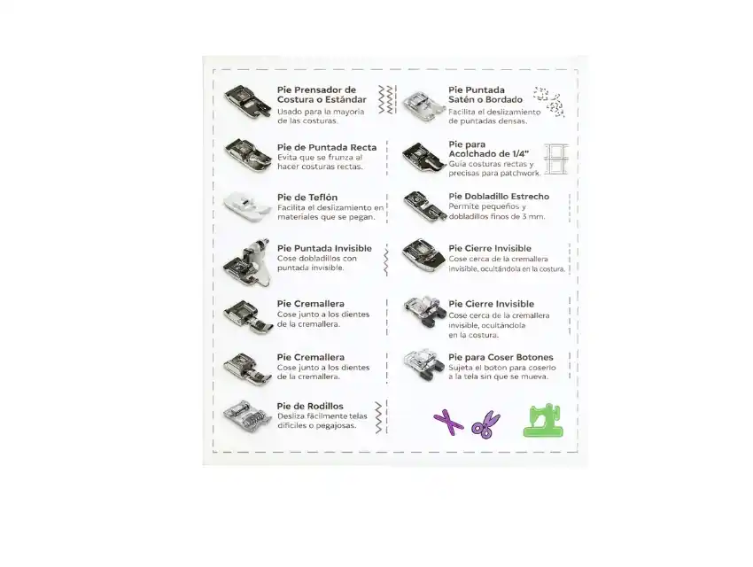 Optimizá tus proyectos de costura con este completo set de pies para máquina. Incluye 11 piezas surtidas que permiten realizar diferentes tipos de costuras y terminaciones con facilidad.