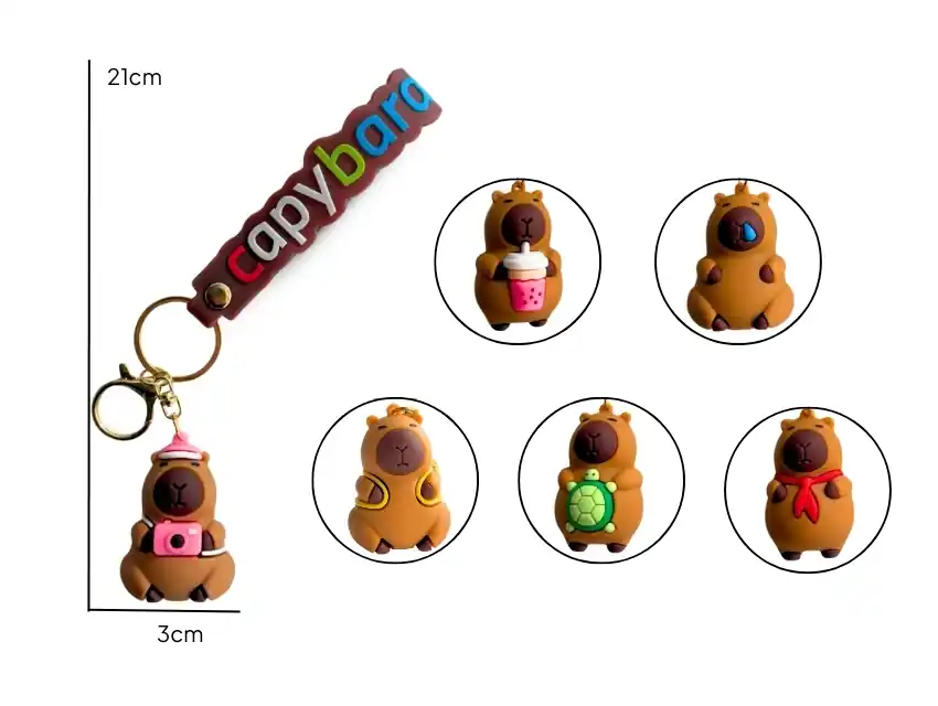 Llavero de capybara en silicona, con diseños surtidos. Ideal para llevar tus llaves o decorar mochilas, bolsos y cartucheras con un toque original y simpático.