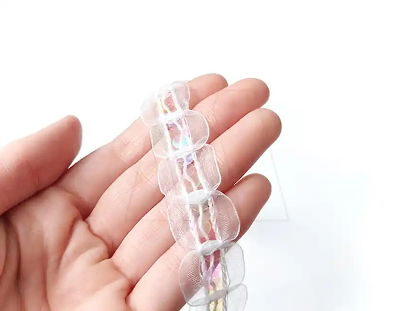 Ideal para agregar brillo y elegancia a tus proyectos de costura y manualidadesIdeal para agregar brillo y elegancia a tus proyectos de costura y manualidadesGALON DE TUL CON LENTEJUELAS IRISADAS 2CM X 10YDSCódigo: 1908Presentación Pieza(s)