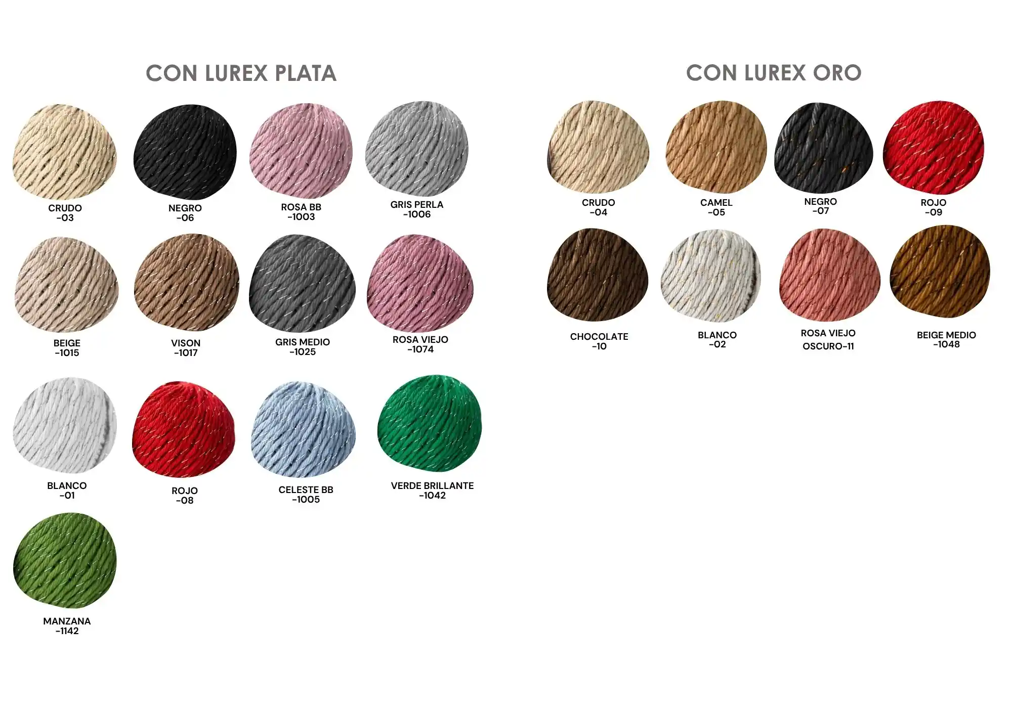 Composición: mix de algodón 8/6 y un cabo fino de lurex. 50grs = aprox 150 mts