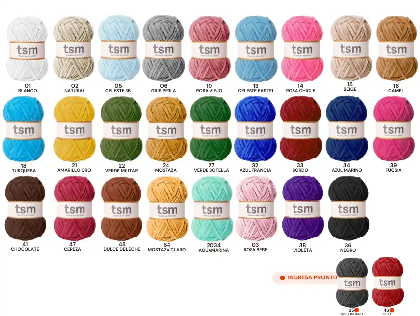 La lana chenille también conocida como "lana polar" es un tipo de hilado aterciopelado y muy suave al tacto, que se caracteriza por su textura esponjosa y aspecto brillante. Se utiliza comúnmente para tejer prendas de vestir, mantas, accesorios decorativos y muñecos, ya que brinda calidez, confort y un acabado elegante. Ideal para proyectos que buscan suavidad y volumen.