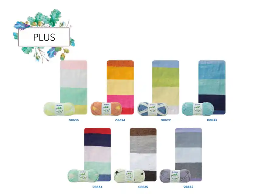 ¡El colorido de Cisne Plus encantará a todos en esta colección! El hilado forma 5 tramas largas de color cuando se teje, ¡y todo con una única madeja!
