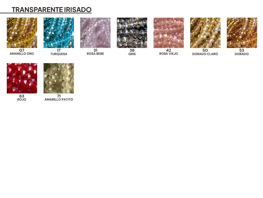 Nuevo TIRA CRISTAL DE ROCA BIJOU 40CM X 5 TIRASCódigo: 2524.5Presentación Bolsa(s)Observación Medida del cristal: 4 mm. Cada tira trae 118 unidades.