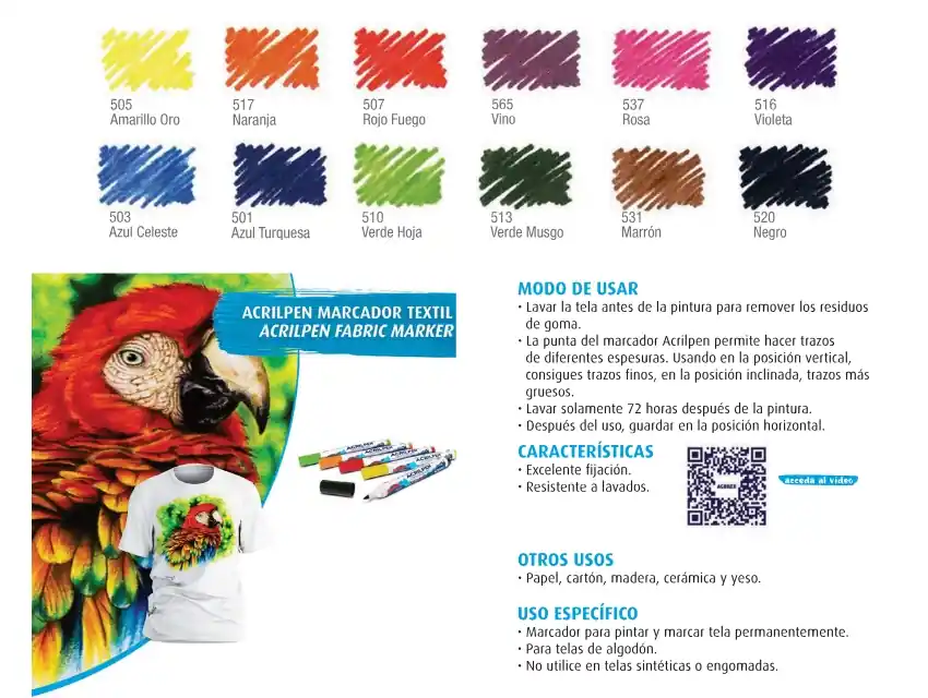 Acrilpen es un marcador para textil, ideal para decorar y personalizar telas de algodón. Su trazo preciso y colores intensos permiten crear diseños únicos. Es resistente al lavado y no requiere fijación térmica.